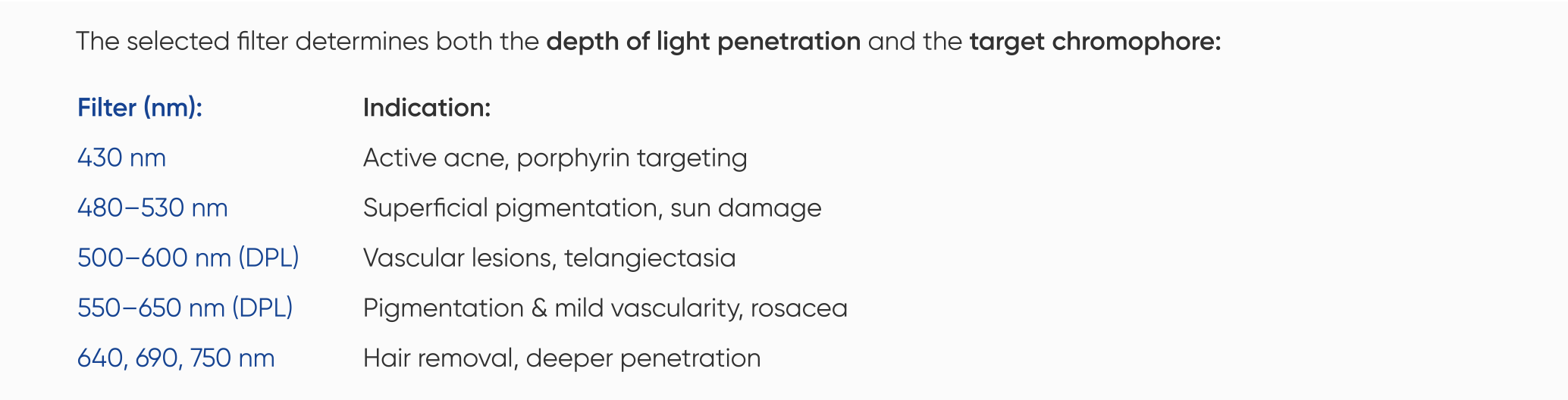 Delivers focused IPL energy to specific skin layers while minimizing exposure to unnecessary wavelengths for safer, more comfortable treatments.