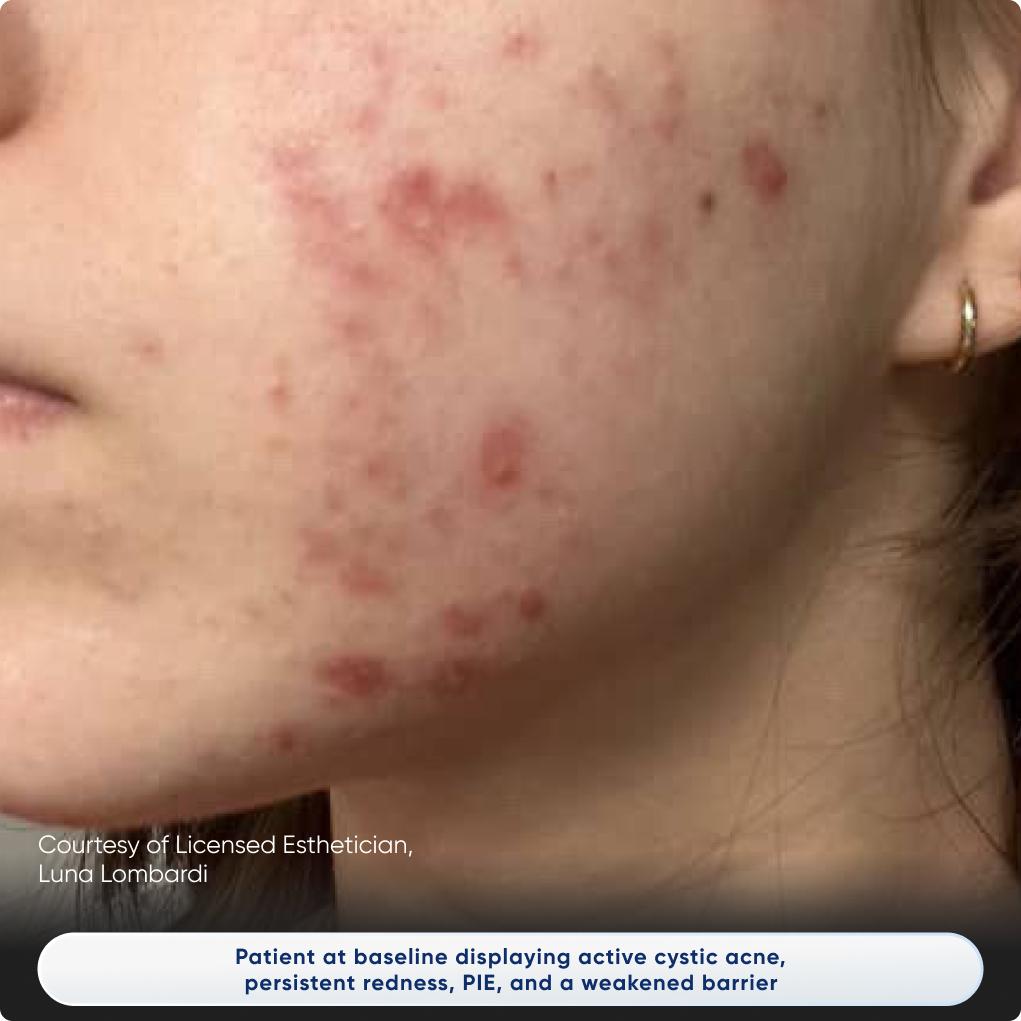 Visible Symptoms: Active cystic acne, persistent redness, Post-Inflammatory Erythema (PIE), and a weakened barrier.