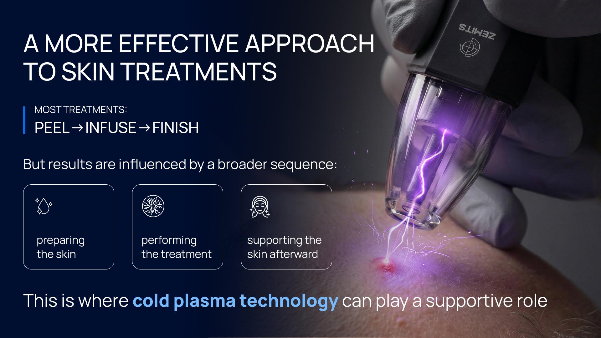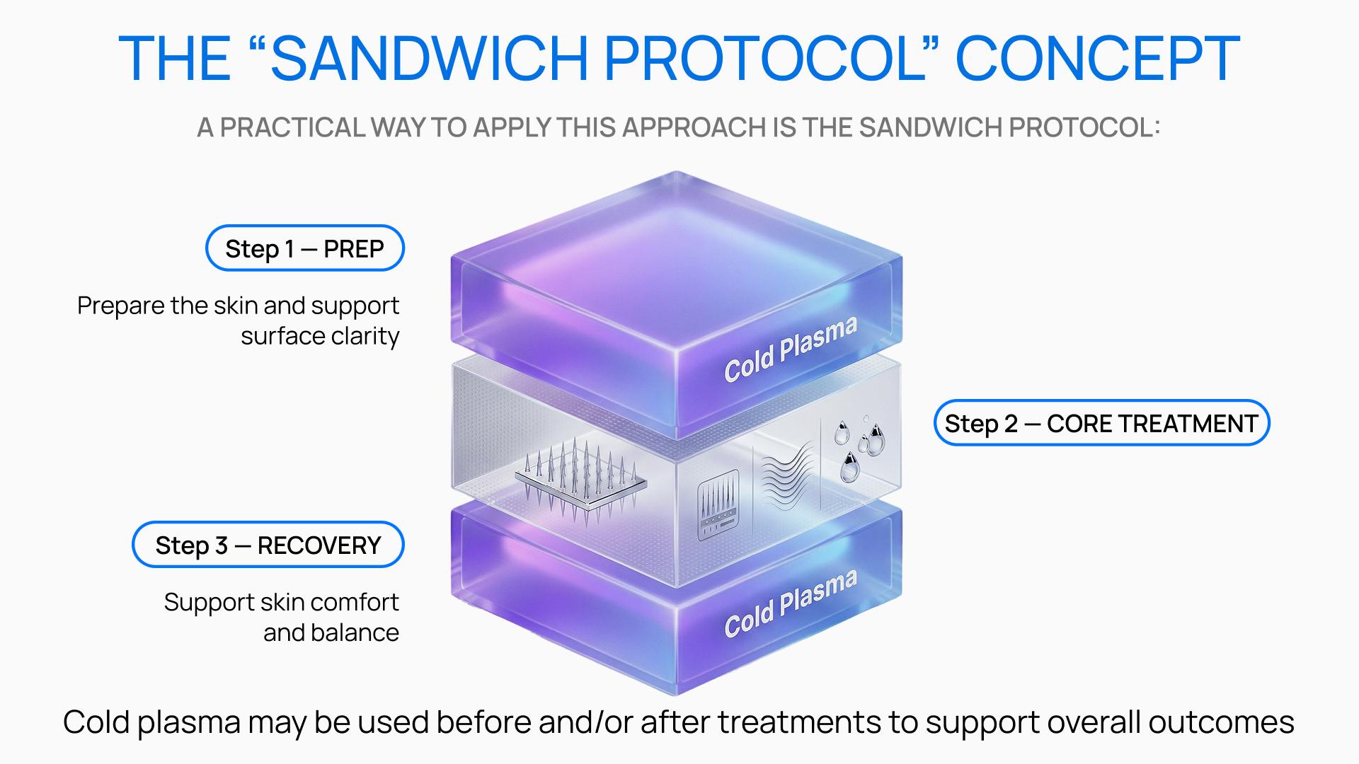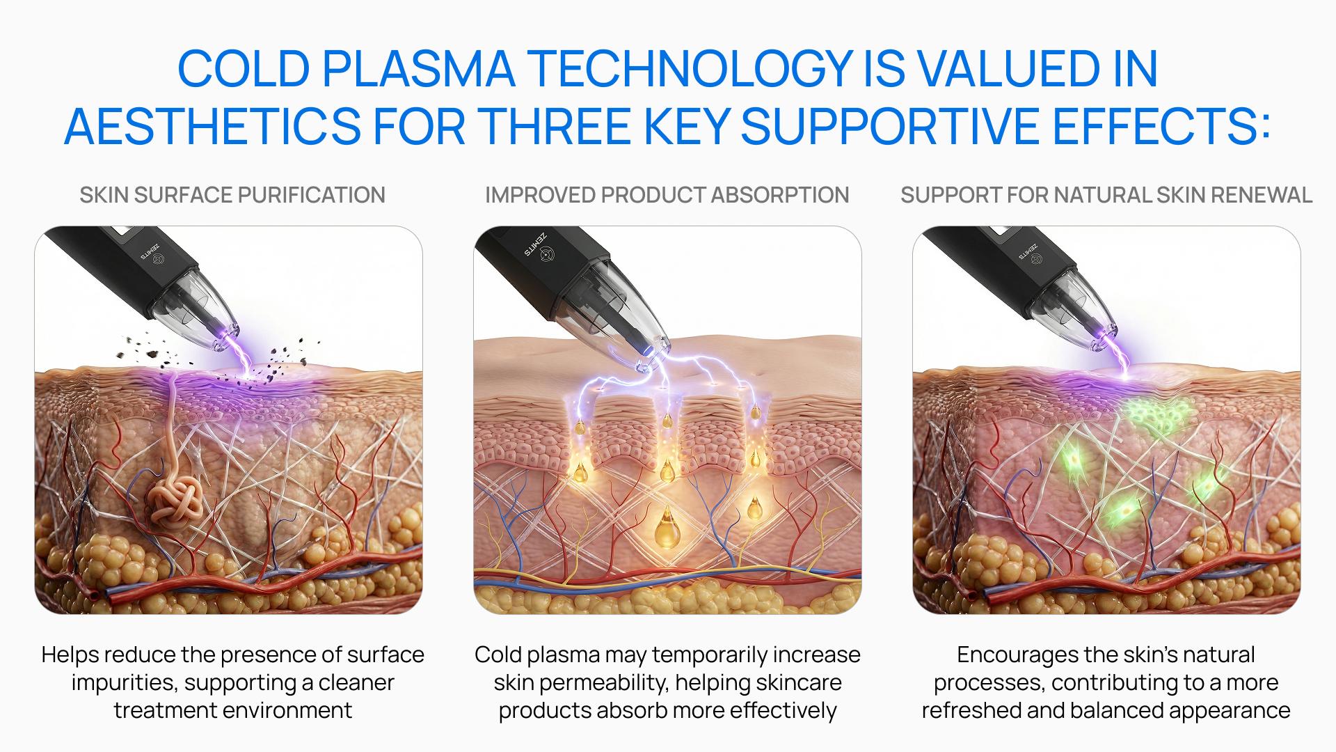 Cold plasma interacts with the skin surface and supports natural skin processes while maintaining comfort during the session.