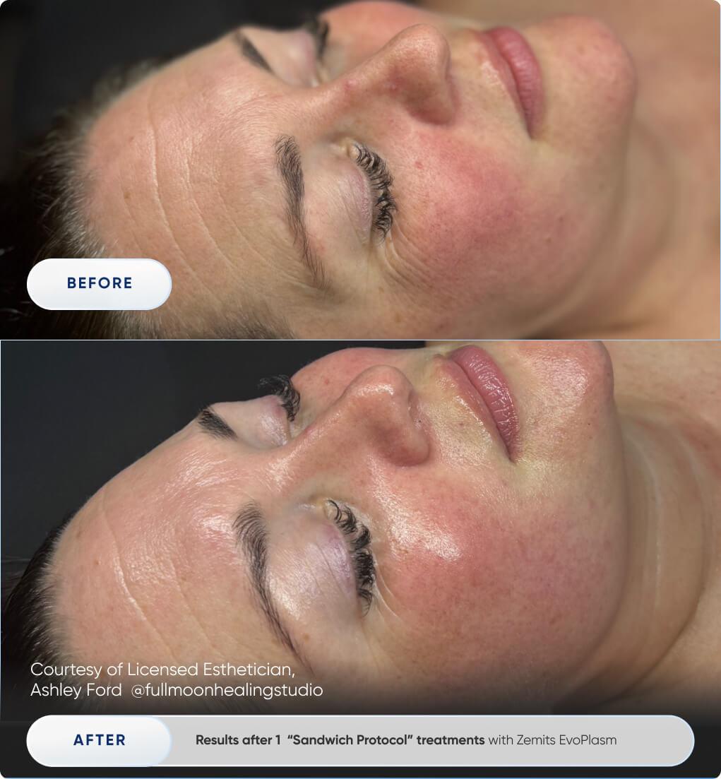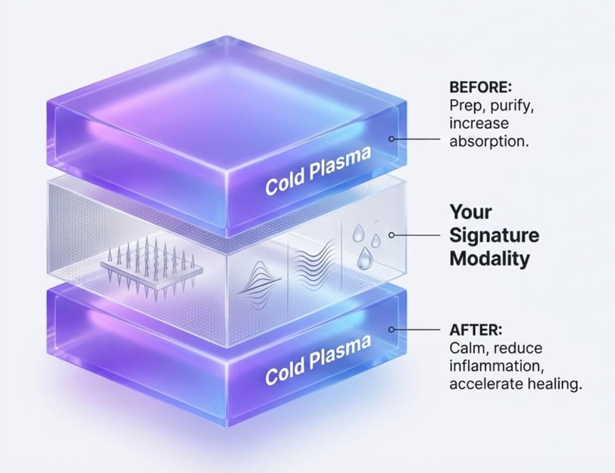 We call this the "Sandwich Protocol." Why? Because we take your proven workflow and simply supercharge it with the Zemits EvoPlasm. This single addition turns a standard facial into a high-performance treatment.